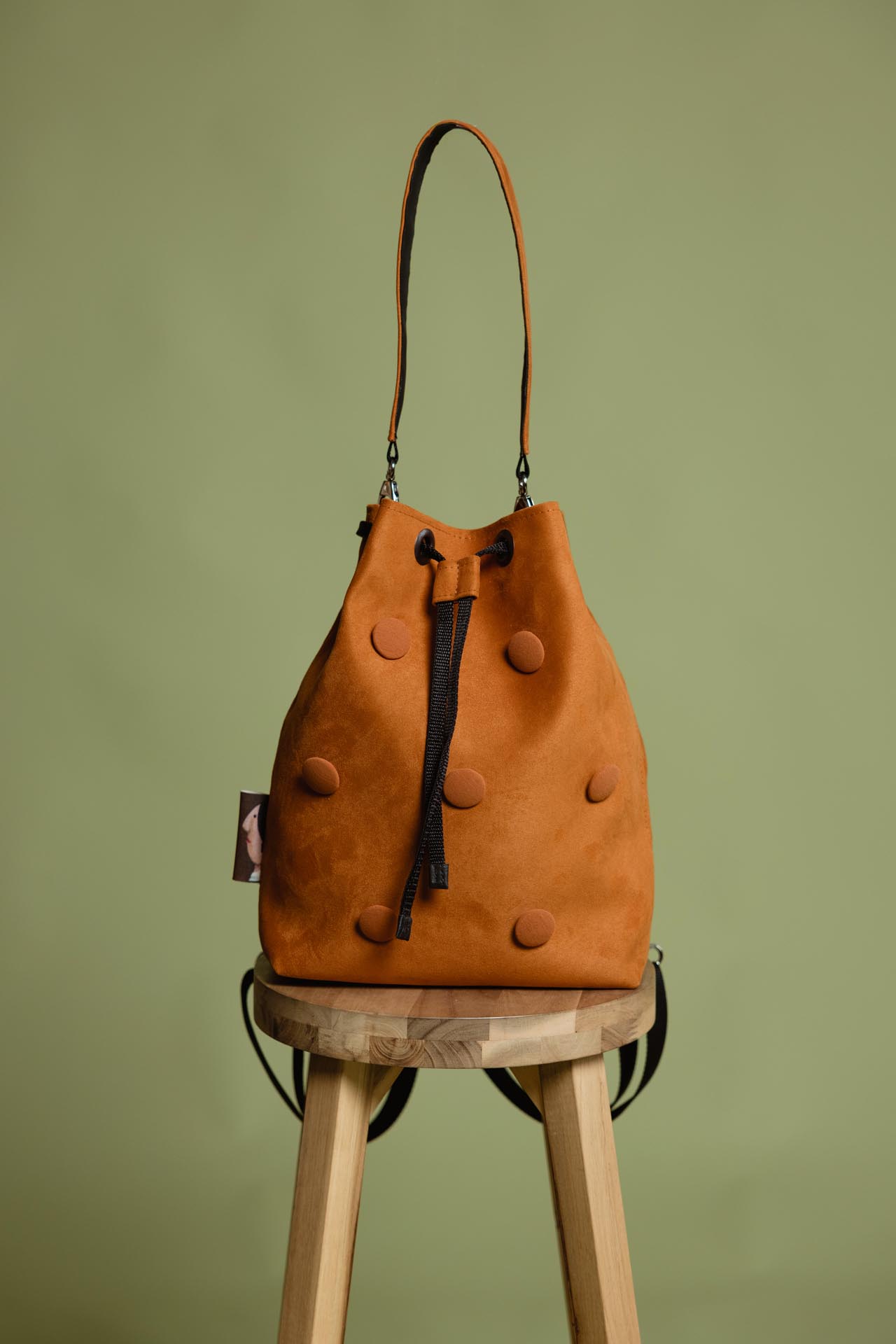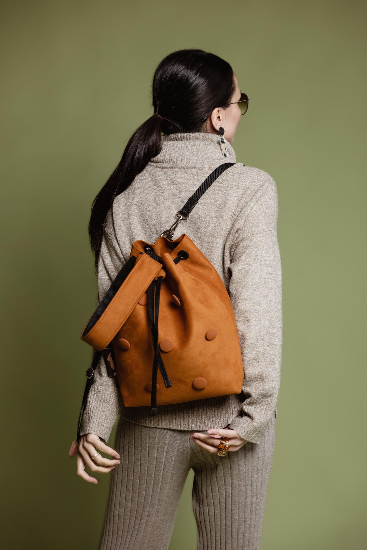 shade, featuring 3D buttons covered in matching fabric. The soft material and striking color are signature characteristics of the Amber bag. It can be worn in several ways: as a backpack, over one shoulder, or carried in hand. The straps are easy to remove and reattach, and the material is water-resistant.