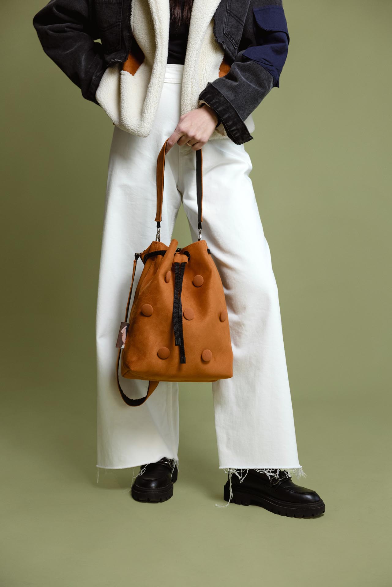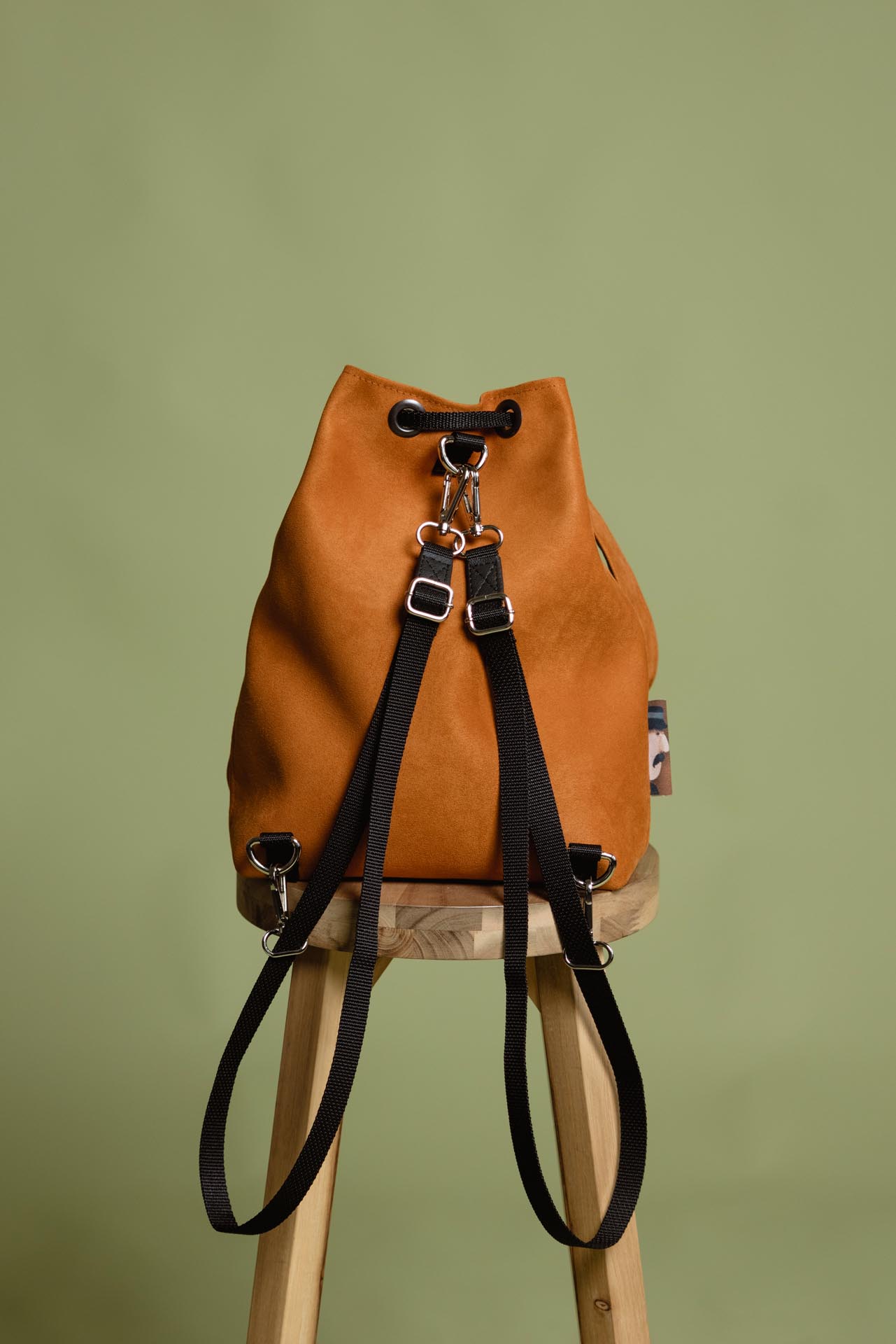 The bag is made from high-quality faux leather with a suede-effect texture in a beautiful ochre