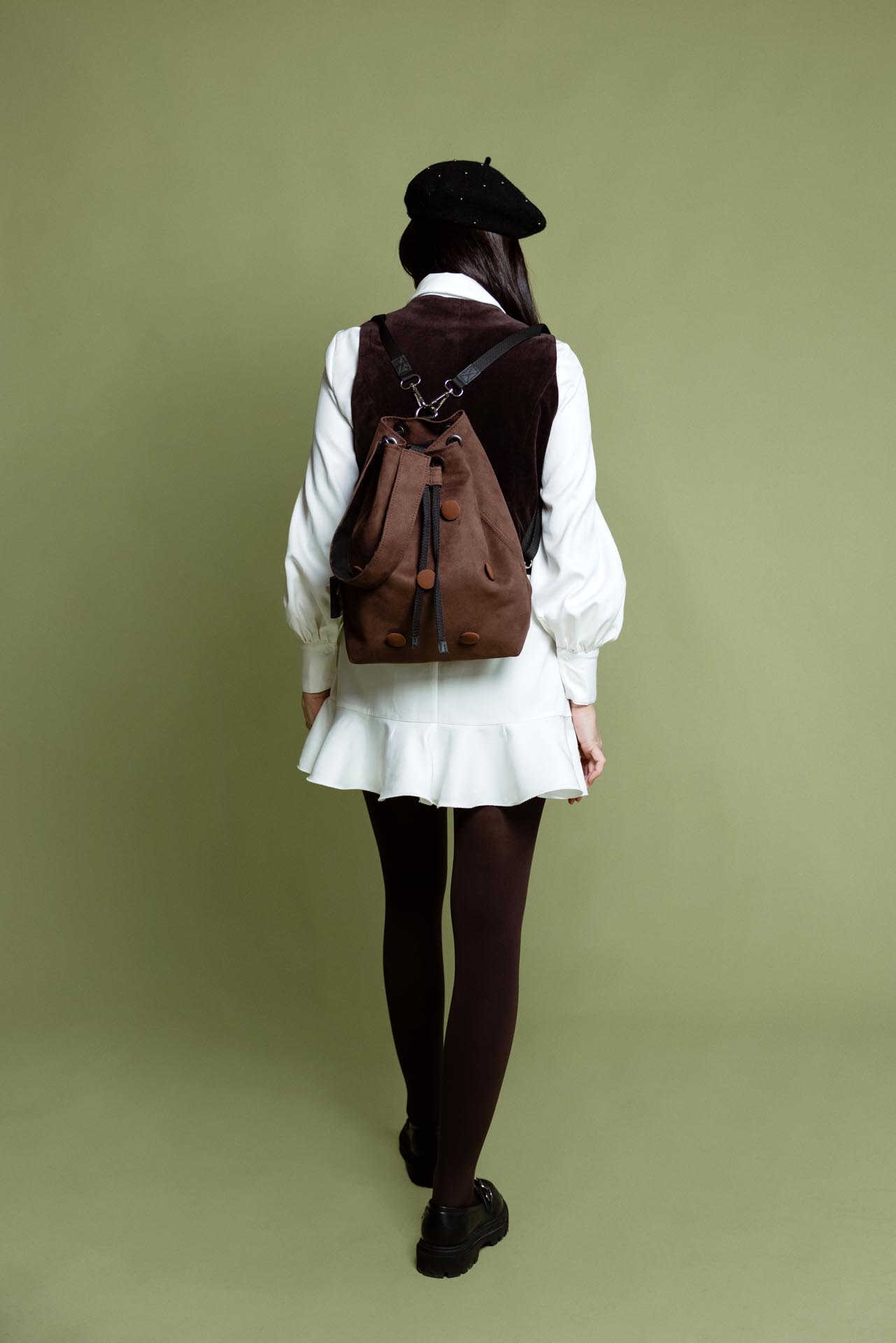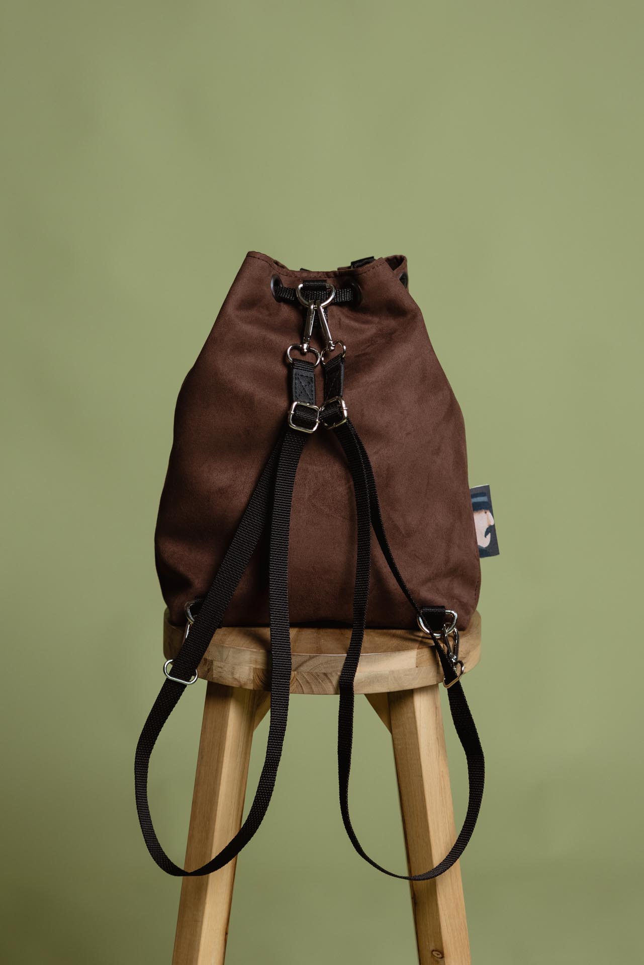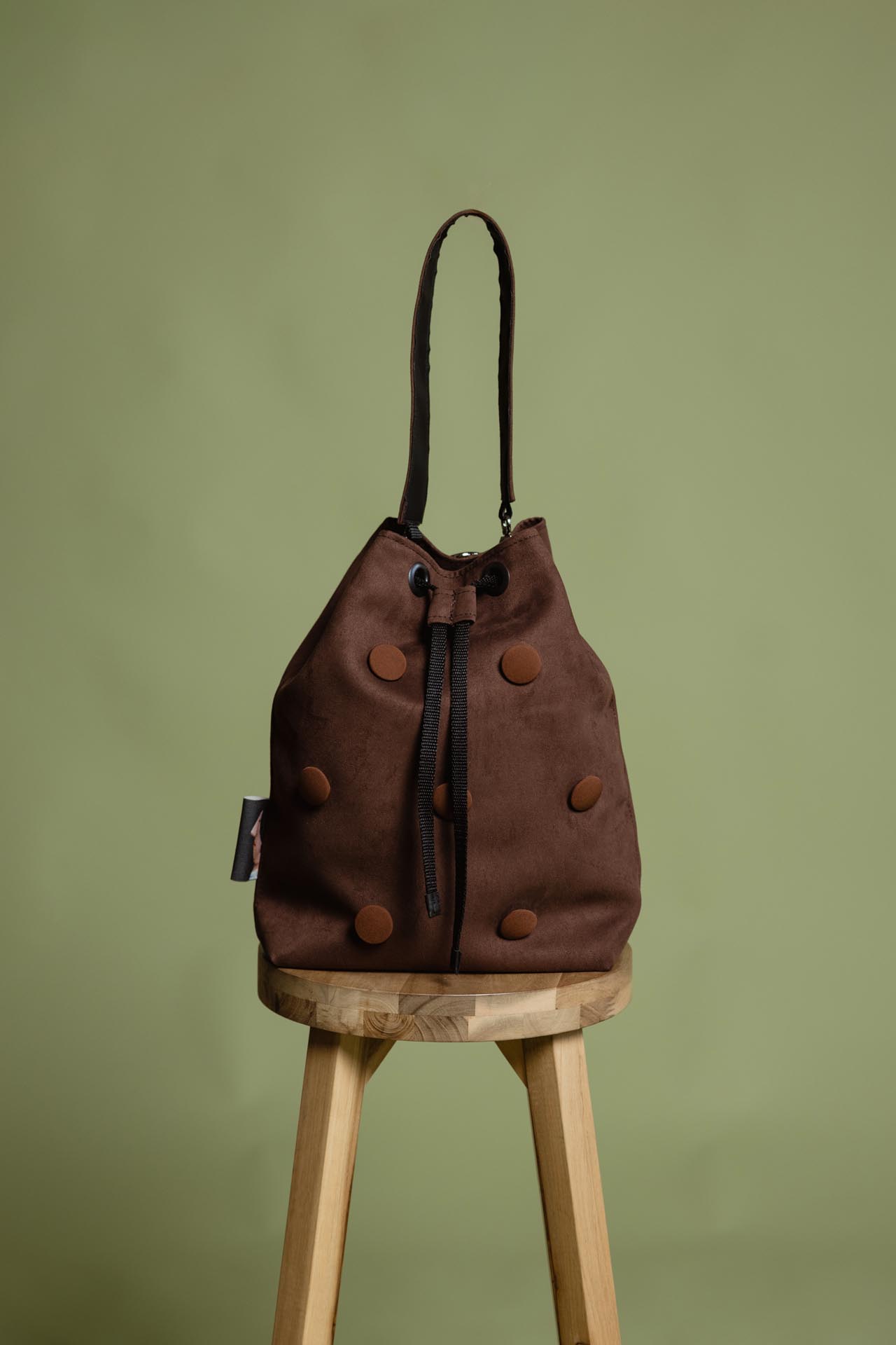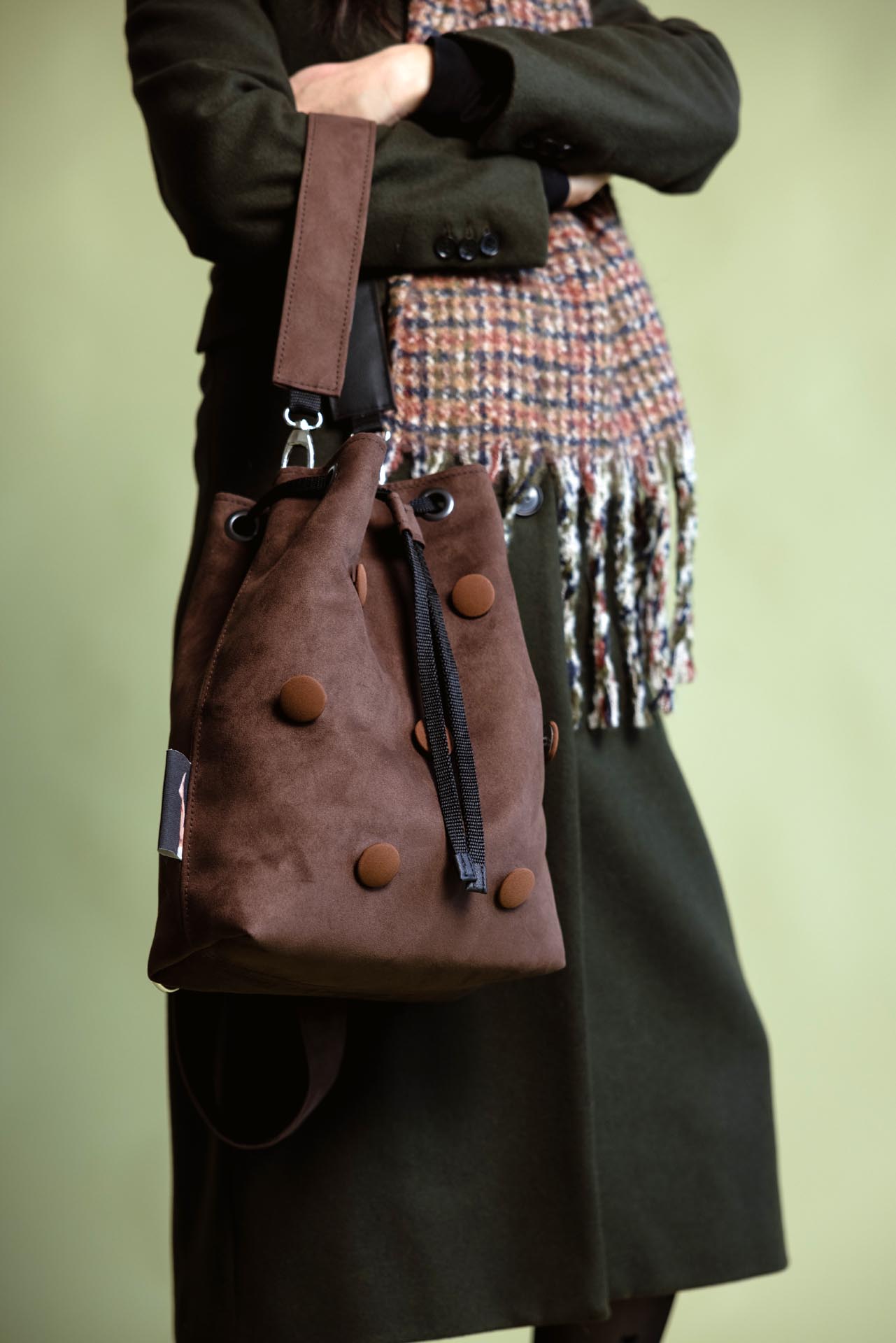 The bag is made of high-quality faux leather with a suede-effect texture in a beautiful brown shade, featuring 3D buttons covered in fabric of the same color. The soft material and stunning color are signature features of the Chocolate bag. It can be worn in several ways: as a backpack, over one shoulder, or carried in hand. The straps are easy to remove and reattach, and the material is water-resistant.